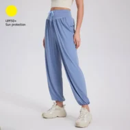 Designed for outdoor activities, these high-waist jogger pants offer sun protection and breathable comfort, ideal for yoga, running, or gym sessions. Made with quick-drying fabric, these full-length trousers feature a drawstring closure for a customized fit.