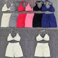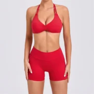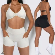 - Design: Halter sports bra with V-back and pocket shorts/leggings for practicality