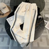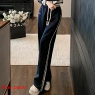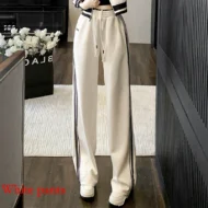 These white wide-leg pants are a stylish addition to any casual or sporty wardrobe, perfect for spring and autumn. Featuring a high waist and a contrasting color design, these pants blend comfort with chic style. Made from a durable mix of spandex, viscose, and polyamide, they offer a slight stretch for ease of movement. The elastic waistband ensures a comfortable fit, while the full-length flare cut gives a flattering, flowy silhouette. Ideal for both casual wear and light sports activities, these pants also come with practical pockets and spliced details for added flair.
